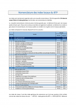 Dernière version actualisée de la nomenclature emboitée des index. Attention, les index suivants sont des index généraux de conjoncture qui n’ont pas vocation à être utilisés comme des index de révision de prix : « BTP 00 – Index général du BTP », « BTR 01/BT 00 - Bâtiment tous corps d’état », « TPR 01/TP 00 - Général tous travaux », « GO 00 - Gros œuvre », « SO 00 - Second œuvre », « GC 00 - Génie civil » et « TS 00 - Travaux spéciaux ».